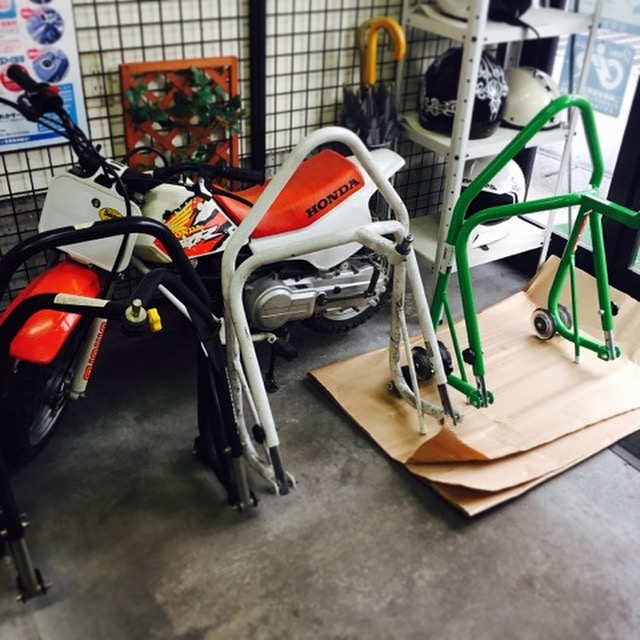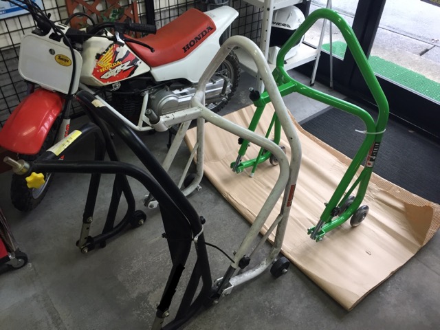 冬期保管用にレーシングスタンドと合わせてZX-14Rに使用されるのですが、実はフロントスタンドは2ヶ目でして・・・画像左側の某輸入工具屋さんで購入したフロントスタンド(黒)でフロントアップして外す時、サイドカウルがバキバキと割れてしまったという珍事をやらかした経緯がありまして・・・左右サイドカウル代¥60,000の出費での苦い経験を経て1年越し待望の今回NEWスタンドのオーダーを頂きました♪お買い上げ大変有難うございました♪