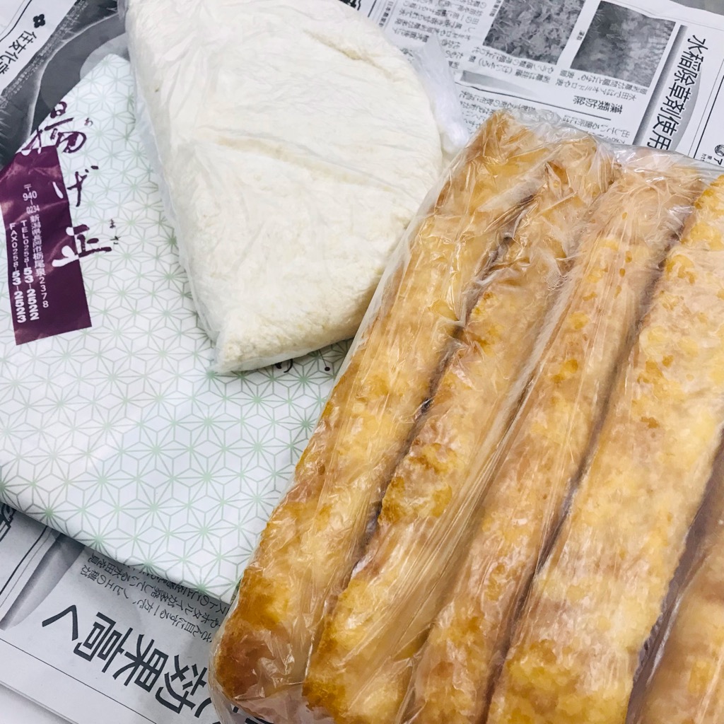 エンジン分解でご入庫のO様から栃尾のあぶらあげとおからを頂いて